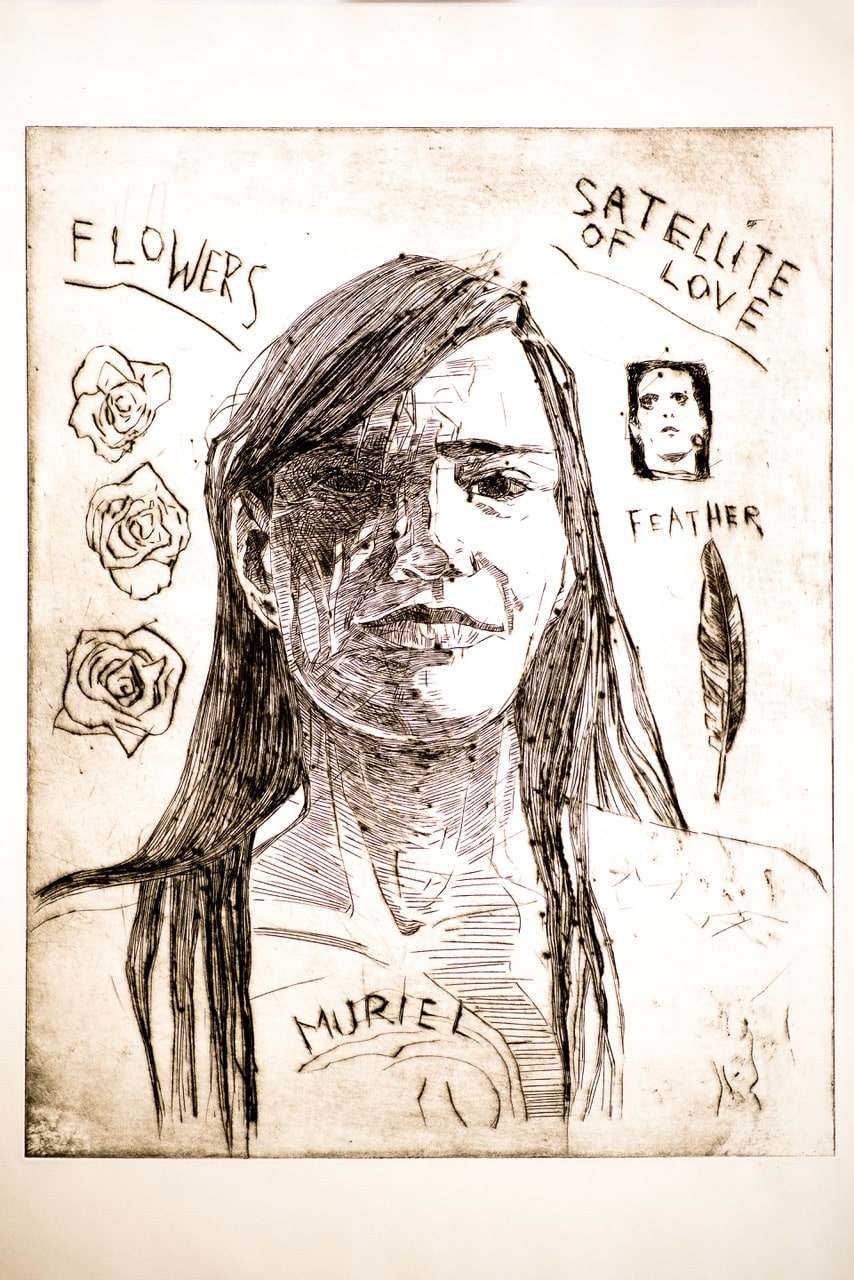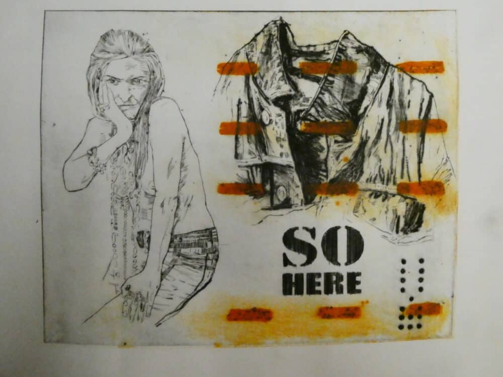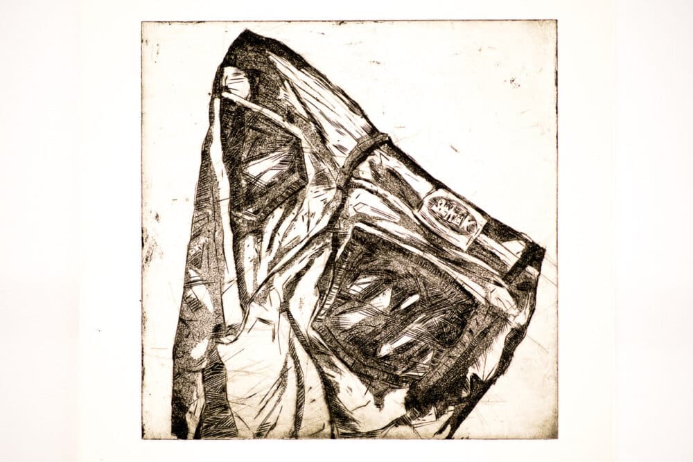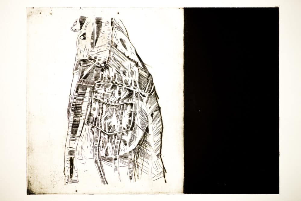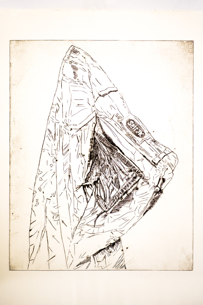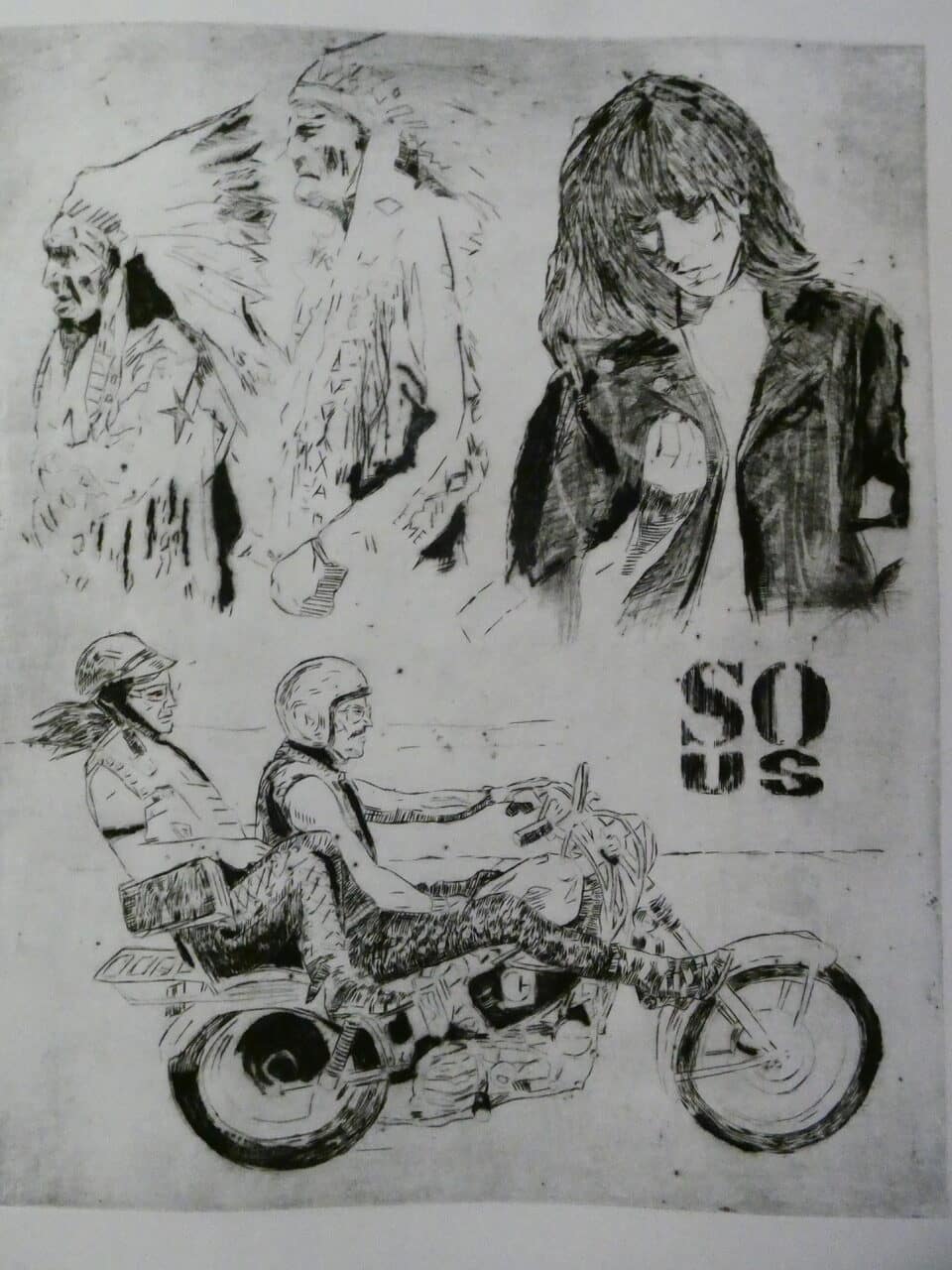MIT STICHEL und Kaltnadel auf Kupferplatten graviert, entstehen Porträts von Punks und Indianern sowie Serien von Jeans-Stilleben als Symbol für Freiheit und Unabhängigkeit.