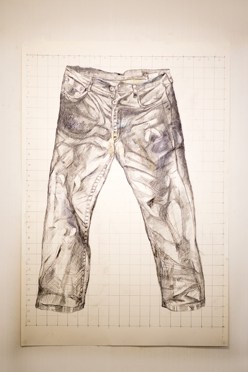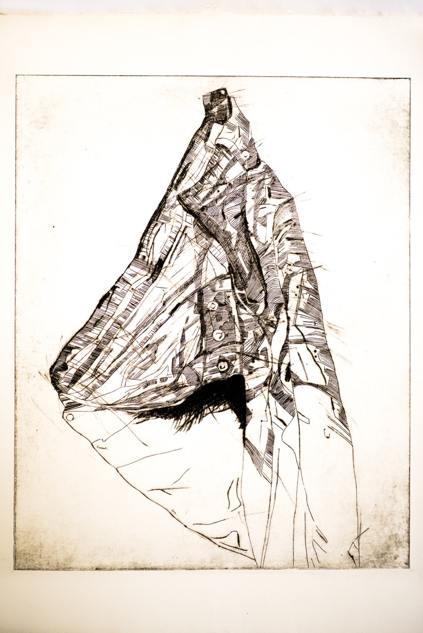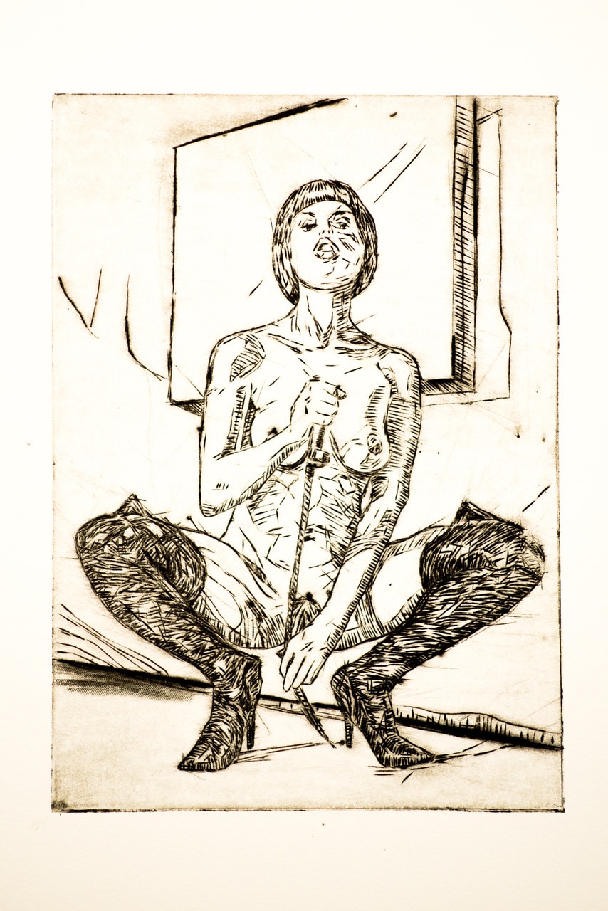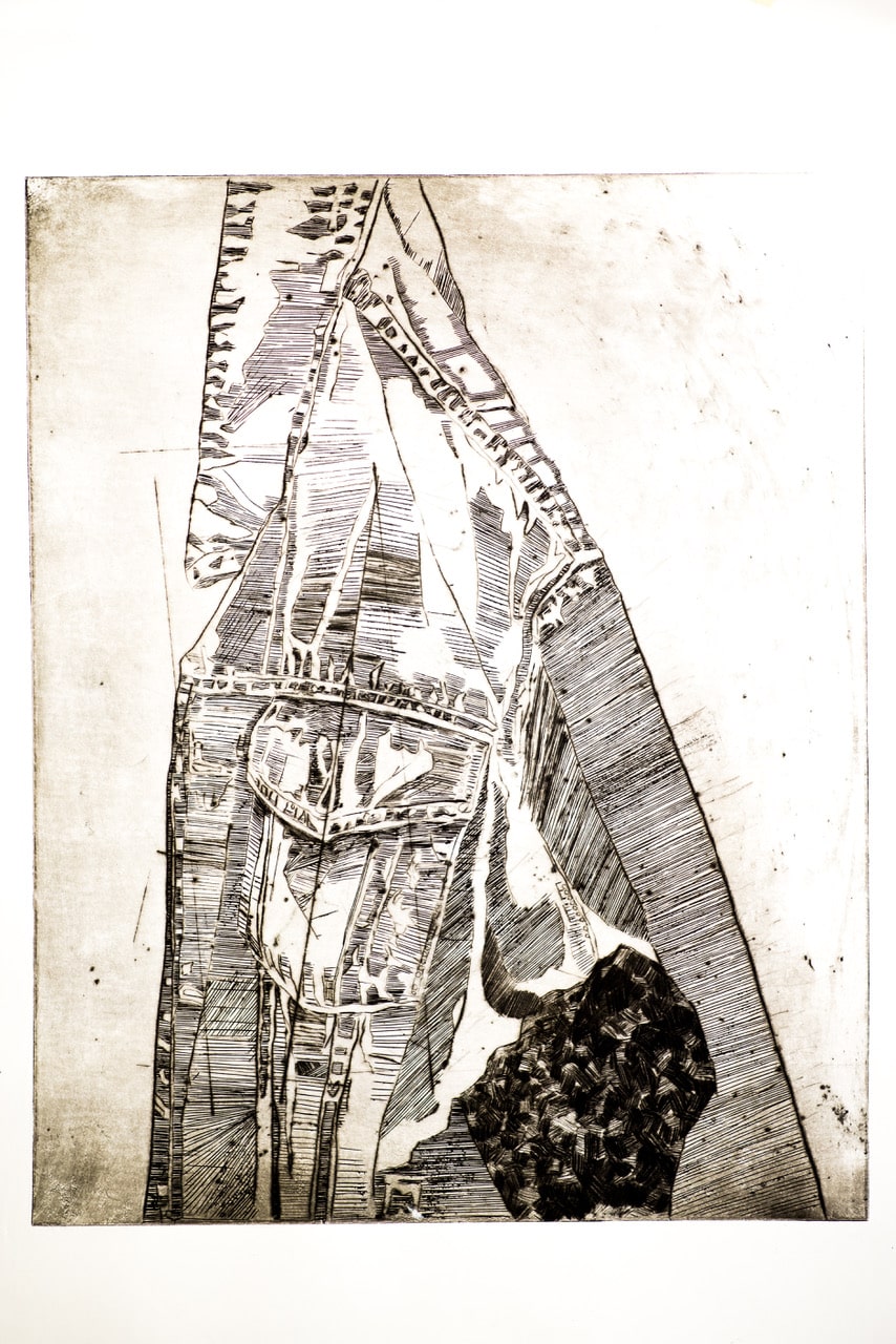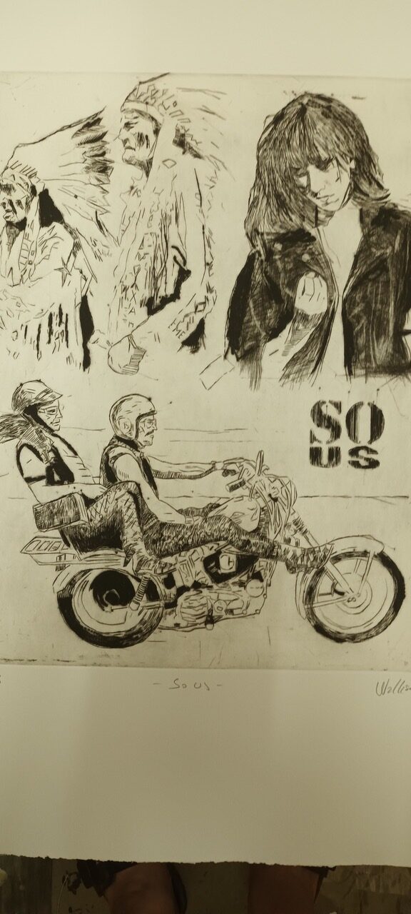 MIT STICHEL und Kaltnadel auf Kupferplatten graviert, entstehen Porträts von Punks und Indianern sowie Serien von Jeans-Stilleben als Symbol für Freiheit und Unabhängigkeit.