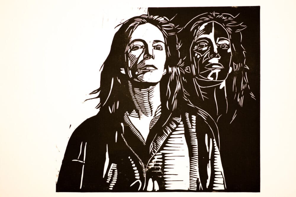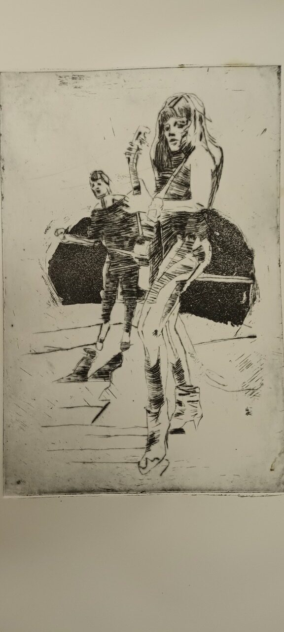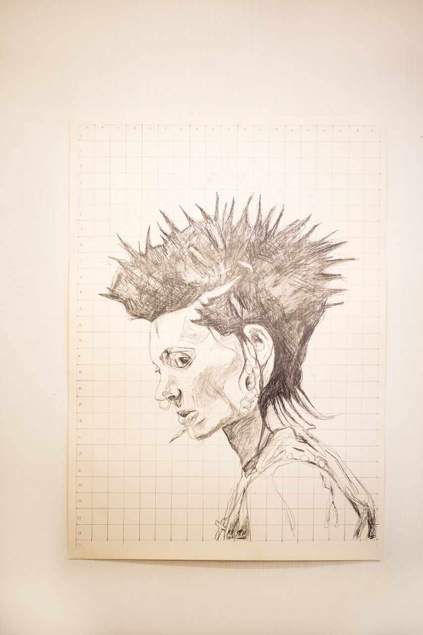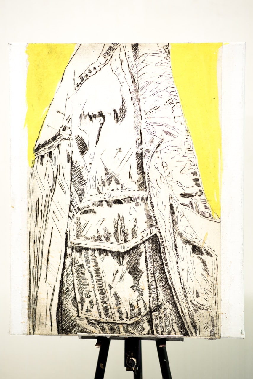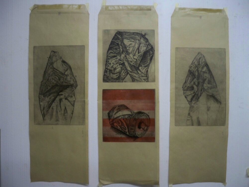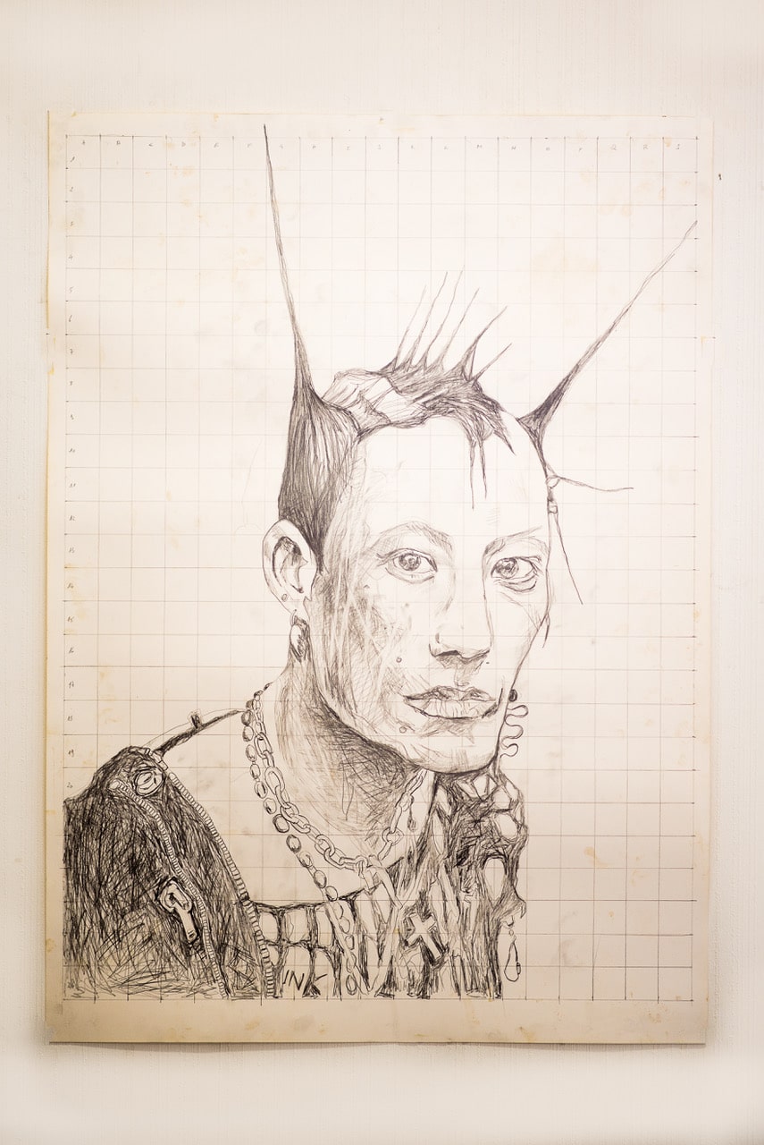 MIT STICHEL und Kaltnadel auf Kupferplatten graviert, entstehen Porträts von Punks und Indianern sowie Serien von Jeans-Stilleben als Symbol für Freiheit und Unabhängigkeit.