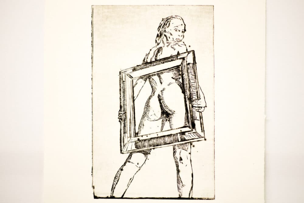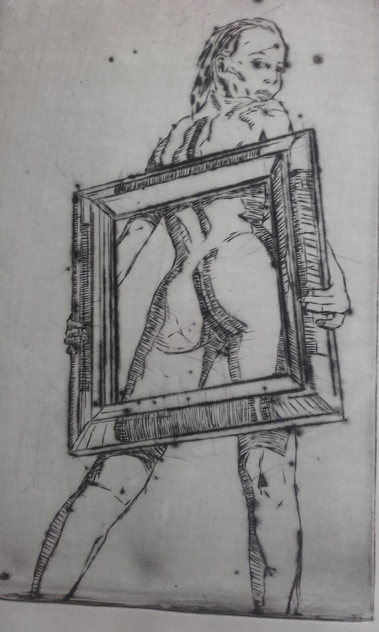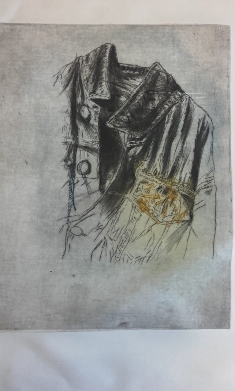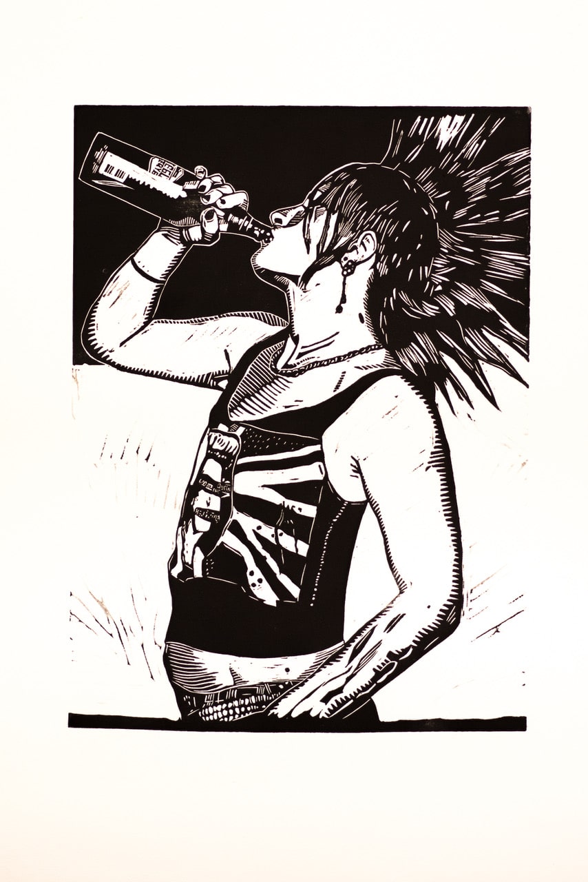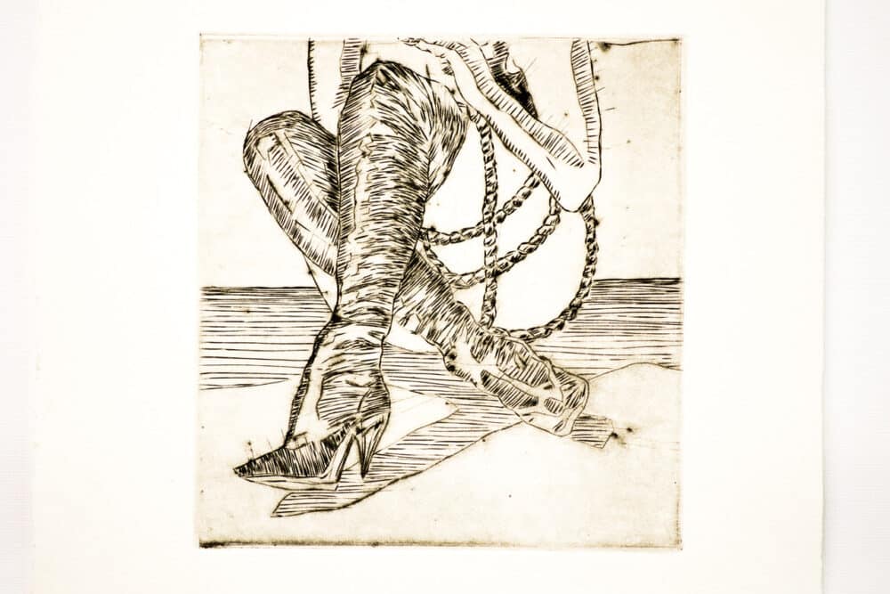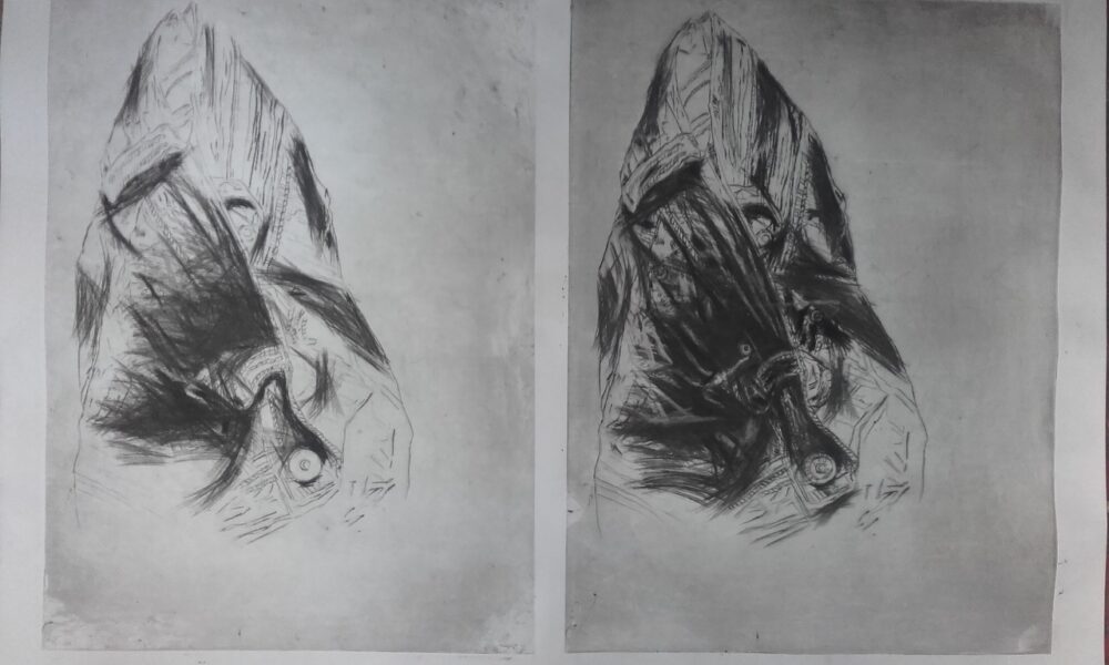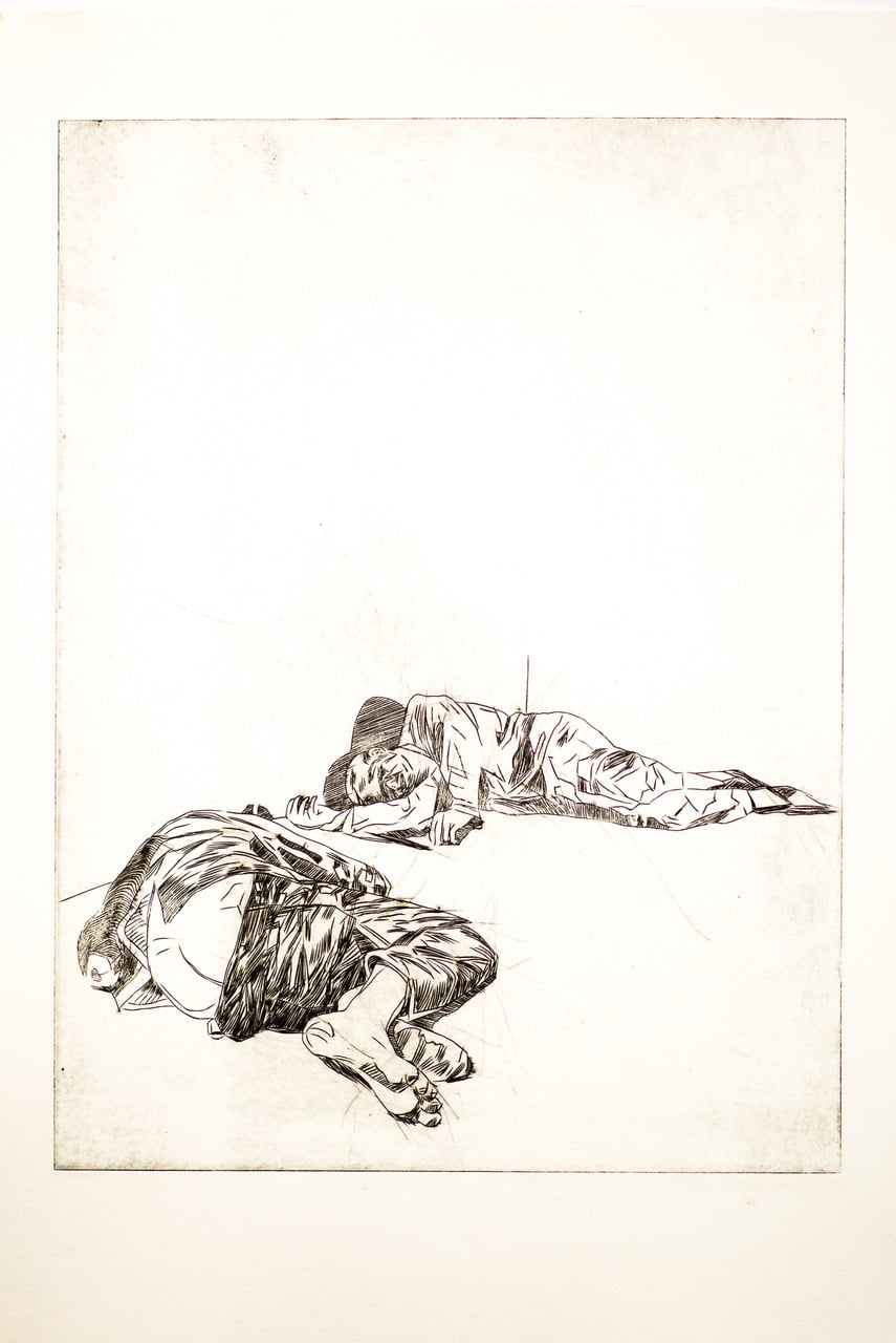 MIT STICHEL und Kaltnadel auf Kupferplatten graviert, entstehen Porträts von Punks und Indianern sowie Serien von Jeans-Stilleben als Symbol für Freiheit und Unabhängigkeit.