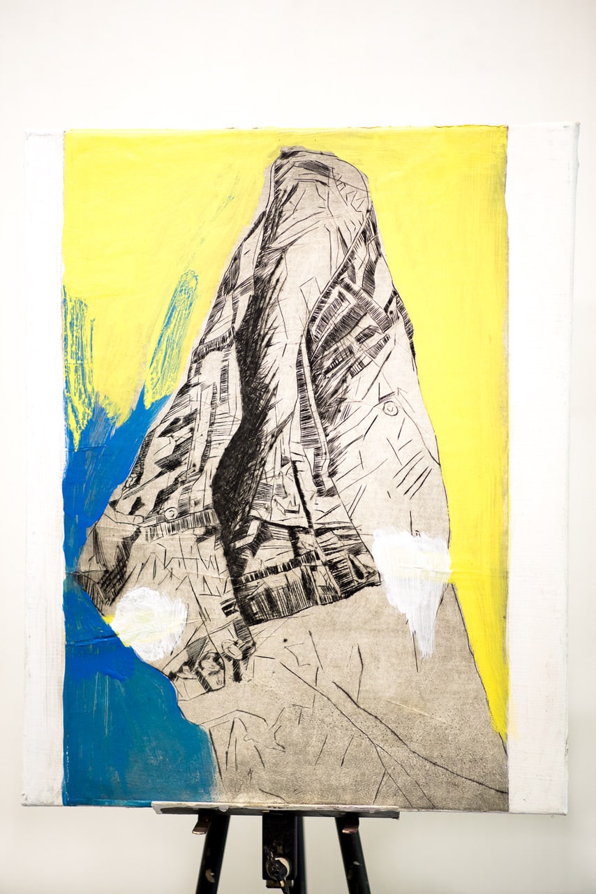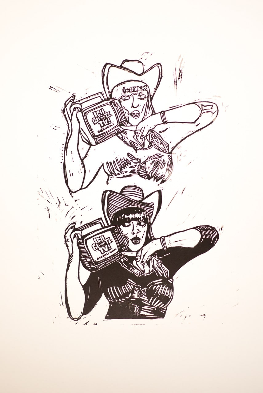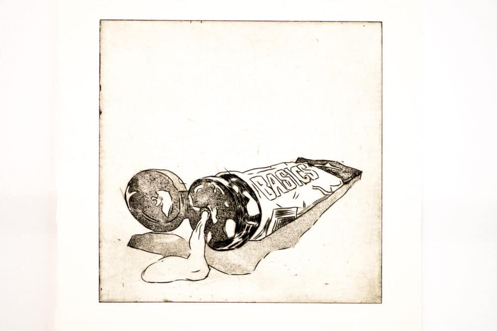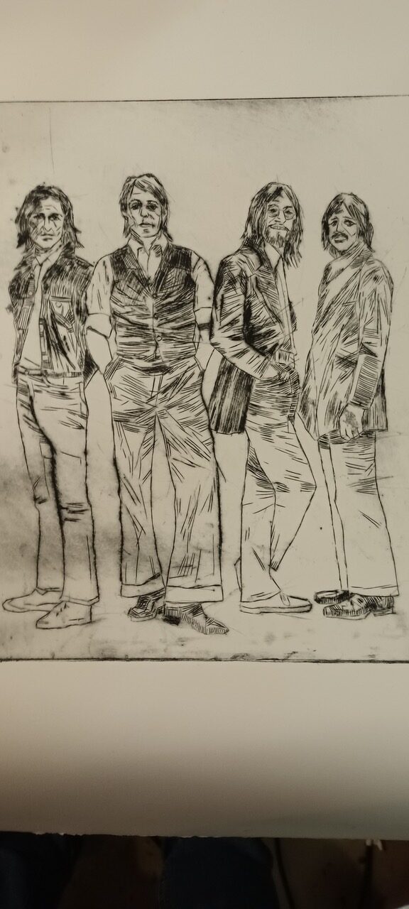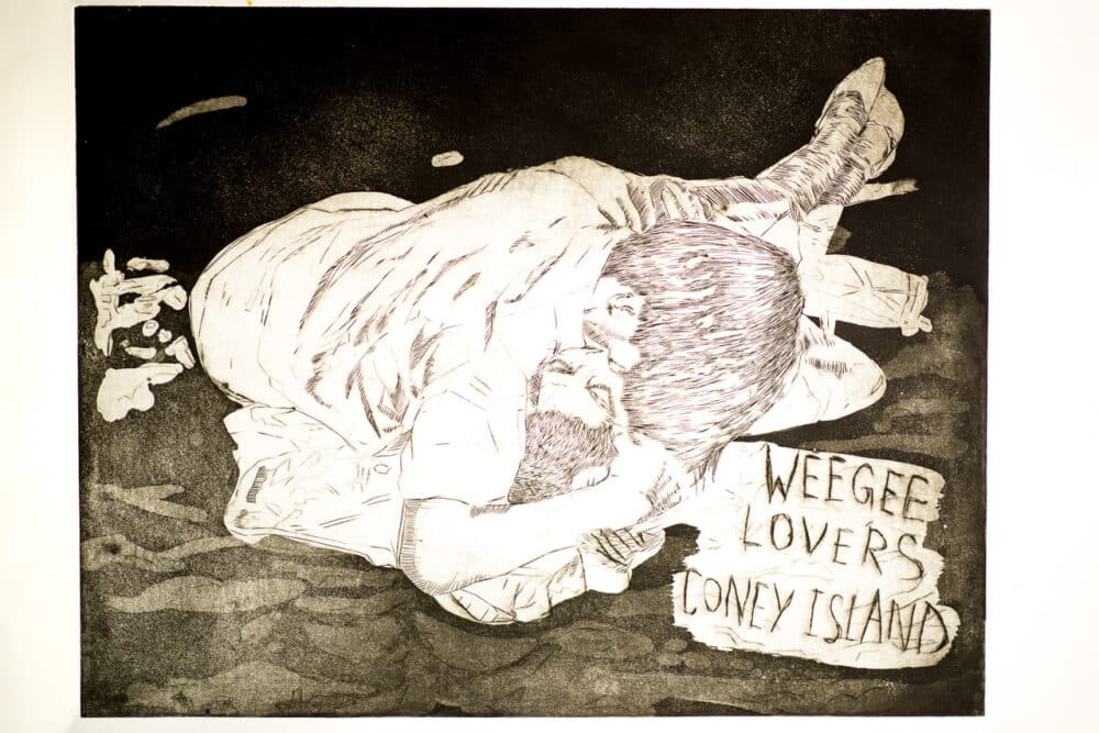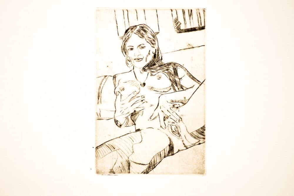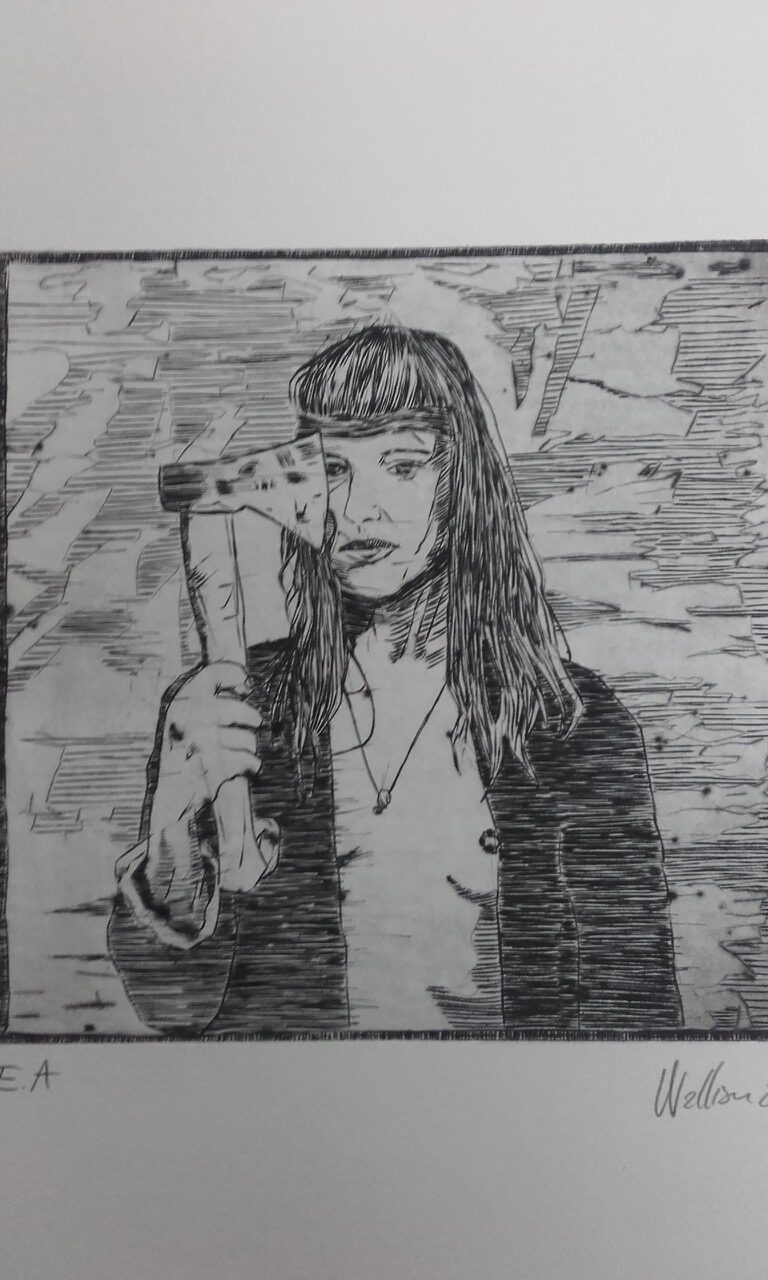 MIT STICHEL und Kaltnadel auf Kupferplatten graviert, entstehen Porträts von Punks und Indianern sowie Serien von Jeans-Stilleben als Symbol für Freiheit und Unabhängigkeit.